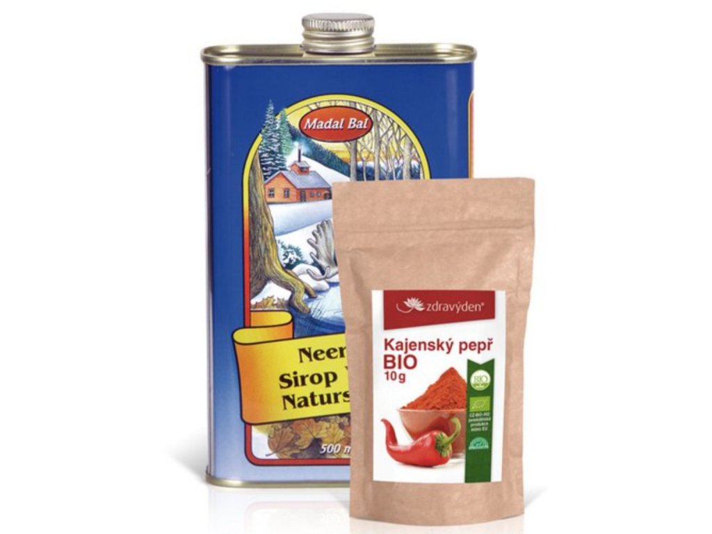 Neera na třídenní kúru: 500ml Neera přírodní stromový sirup, Kajenský pepř BIO 10g a leták s podrobným popisem kúry.